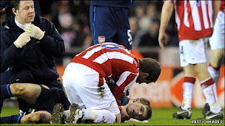 Latest freak accident! Young Gunner Ramsey got his leg broken after being tackled down by Stoke City's Shawcross. Man, this just reminds me of how Michael Owen, Djibril Cisse, Eduardo, and Diaby got their legs broken too! Scary